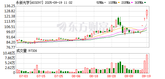 永新光学盘中涨停,已连收3个涨停板,截至10:03,该股报130.92元,换手率7.31%,成交量809.85万股,成交金额10.13亿元,涨停板封单金额为2.41亿元。连续涨停期间,该股累计上涨33.10%,累计换手率为14.98%。最新A股总市值达145.24亿元,A股流通市值144.97亿元。