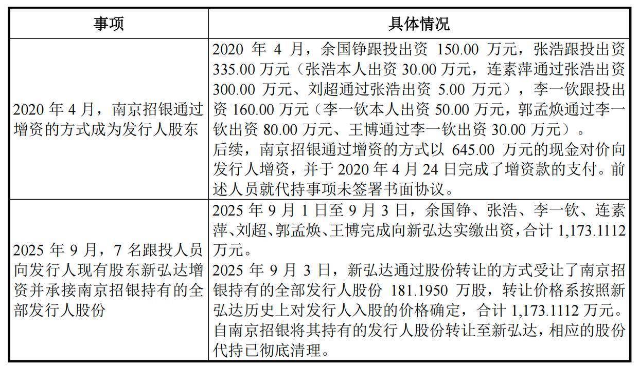 2025年9月,7名跟投人员向公司现有股东新弘达增资并承接南京招银持有的全部公司股份。