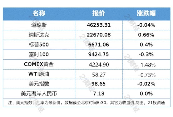 纽约股市三大股指10月15日涨跌不一。截至当天收盘,道琼斯工业平均指数比前一交易日下跌17.15点,收于46253.31点,跌幅为0.04%;标准普尔500种股票指数上涨26.75点,收于6671.06点,涨幅为0.40%;纳斯达克综合指数上涨148.38点,收于22670.08点,涨幅为0.66%。